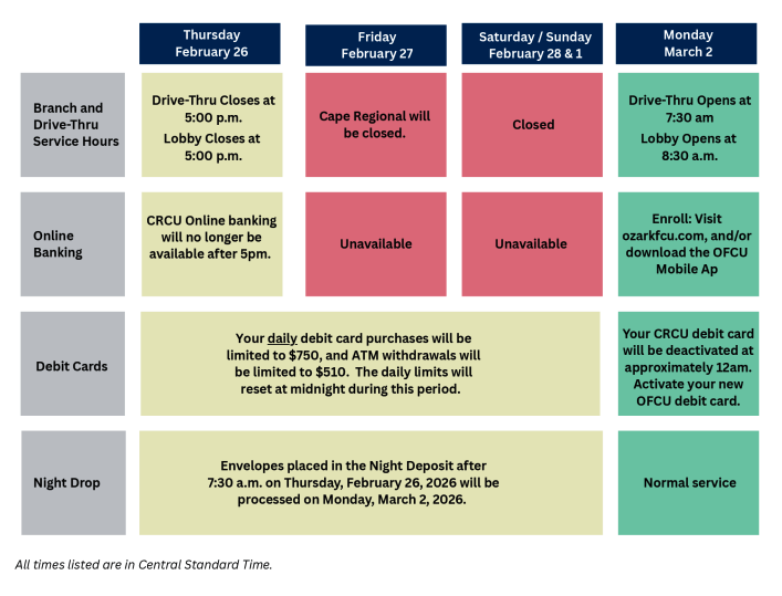 Both the Cape Girardeau and Jackson Cape Regional Credit Union branches will close at noon on Friday, February 27 and will re-open as Ozark Federal Credit Union for normal hours starting Monday, February 2, 2026.