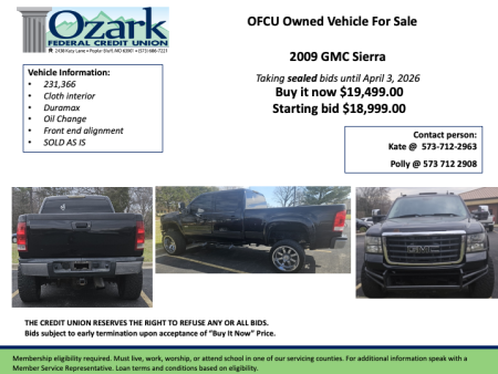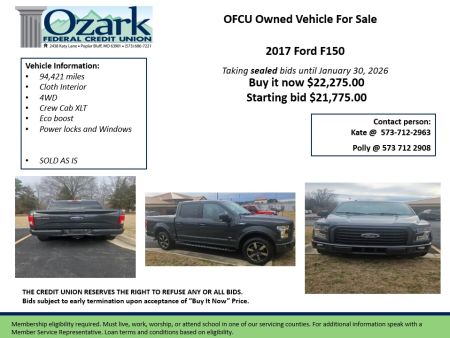 For inquiries regarding any of our Ozark Federal Credit Union-owned vehicles, please contact Kate Pogue, our Member Solutions Specialists in the Loan Department.
